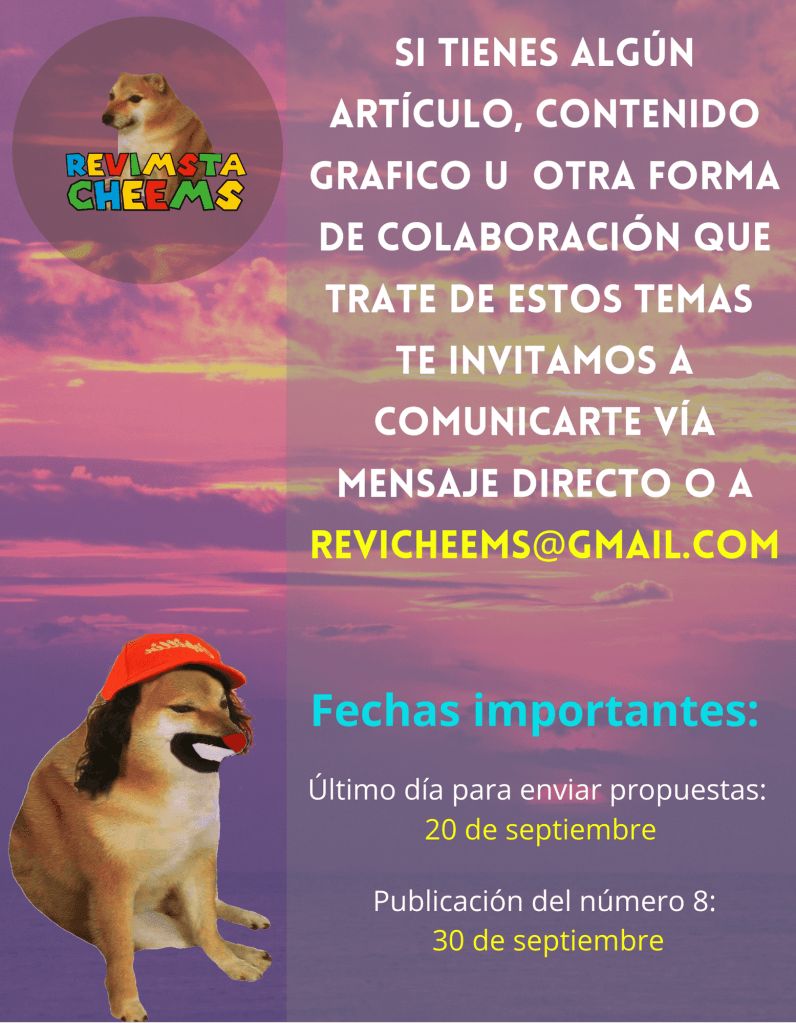 Esta es la convocatoria para el número 8 de la Revimsta Cheems. Si deseas colaborar o tienes alguna duda puedes escribir a revicheems@gmail.com o por mensaje a la página de la Revimsta Cheems