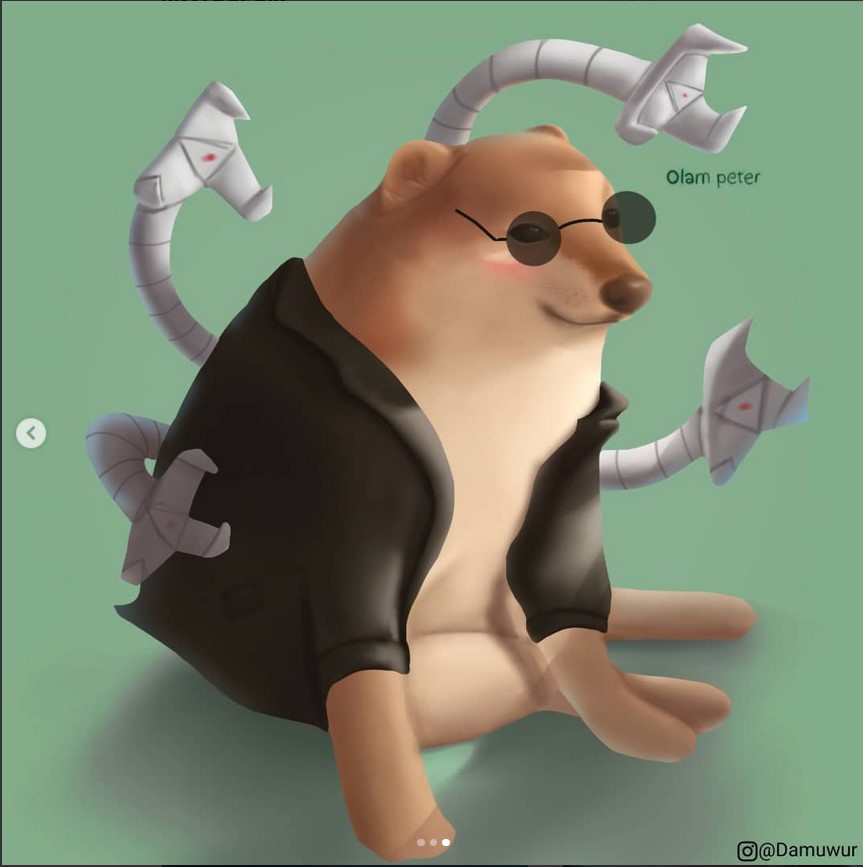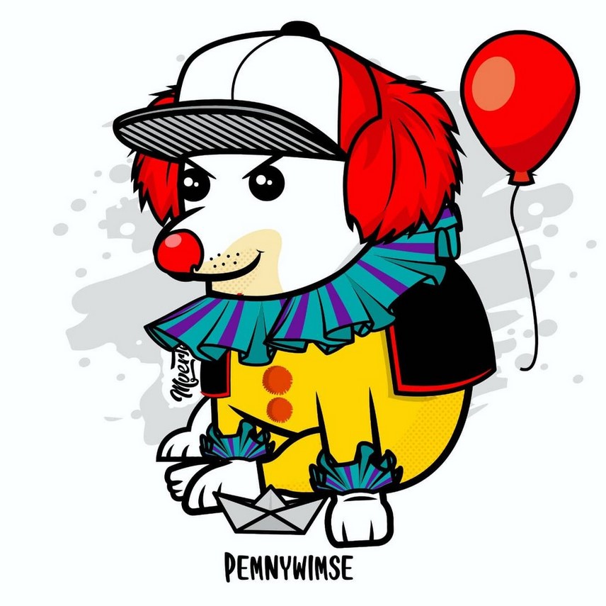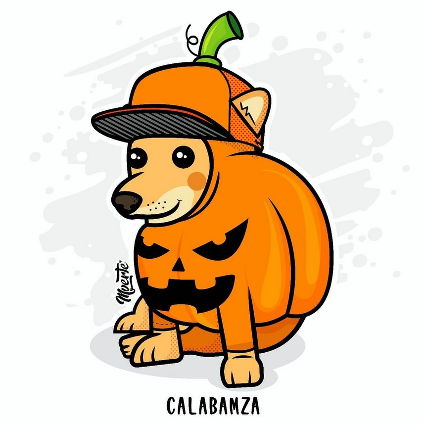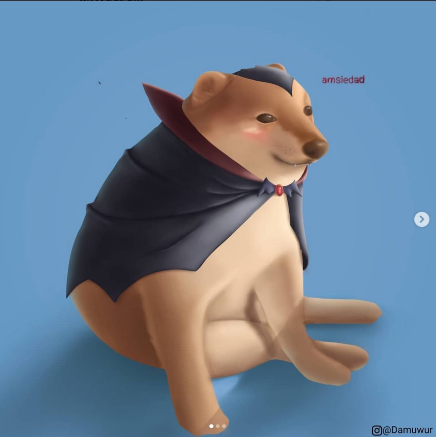 Prácticamente, es el mismo Cheems pero con ropita diferente una y otra vez. Y eso es lo impresionante, la manera en que Mverte hace ver tan finamente marcada la referencia cultural y cómo es que se aventura a referencias que sólo pueden encontrarse en su trabajo; ¿un Cheems IT? Eso era teóricamente imposible hasta que vimos su publicación. Como apunte especial, noten el uso del color, este ilustrador, dibujante, tatuador, etc., sabe perfectamente dónde empieza y dónde acaba cada tono en sus toons.