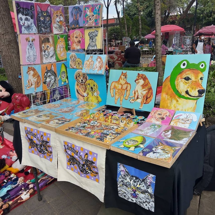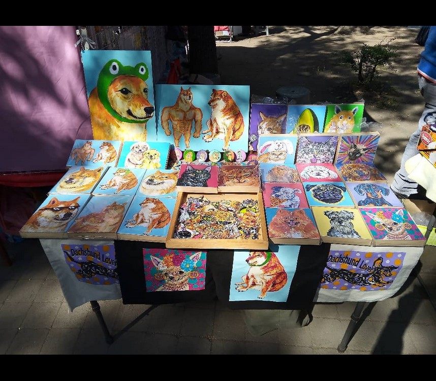 Pintora, tallerista, artesana, amante de los animales. Ediciones Perro negro Callejero tiene detrás a un artista cuyo trabajo habla por sí mismo y que les invitamos a conocer, pero en especial, adquirir. Vende cuadros, vende bolsas, vende stickers y todos son productos originales y de calidad, además ella tiene algo que nadie más vende: papel para envolver regalos de Cheems